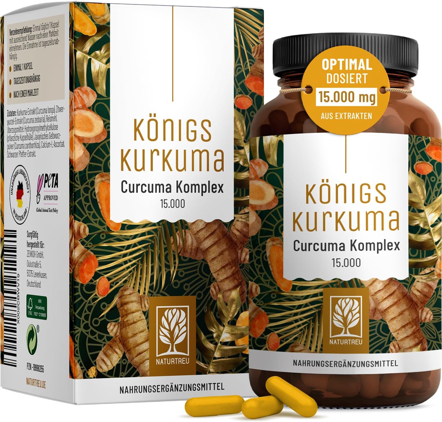 NATURTREU Königskurkuma bietet einen durchdachten Kurkuma-Komplex: pro Kapsel 95 % Curcumin, gewonnen aus über 15.000 mg Curcuma, kombiniert mit Piperin zur Unterstützung der Aufnahme und Vitamin C. Vitamin C trägt zur normalen Kollagenbildung (Knorpel), zur normalen Funktion des Immunsystems und zu einem normalen Energiestoffwechsel bei. Die Kapseln sind 100 % vegan, ohne unerwünschte Zusatzstoffe, ohne Gentechnik, laborgeprüft und mit Qualitätssiegeln ausgezeichnet. Mit 4,6 von 5 Sternen auf Amazon liefert das Produkt ein transparent deklariertes, hochwertiges Gesamtpaket für alle, die ein hochdosiertes Curcuma-Präparat mit sinnvoller Kombination suchen.